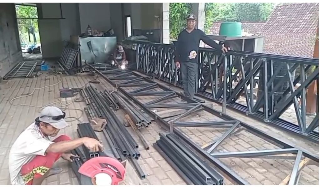 Sugiyono menyiapkan rangka atap Gedung KDMP Karangjong